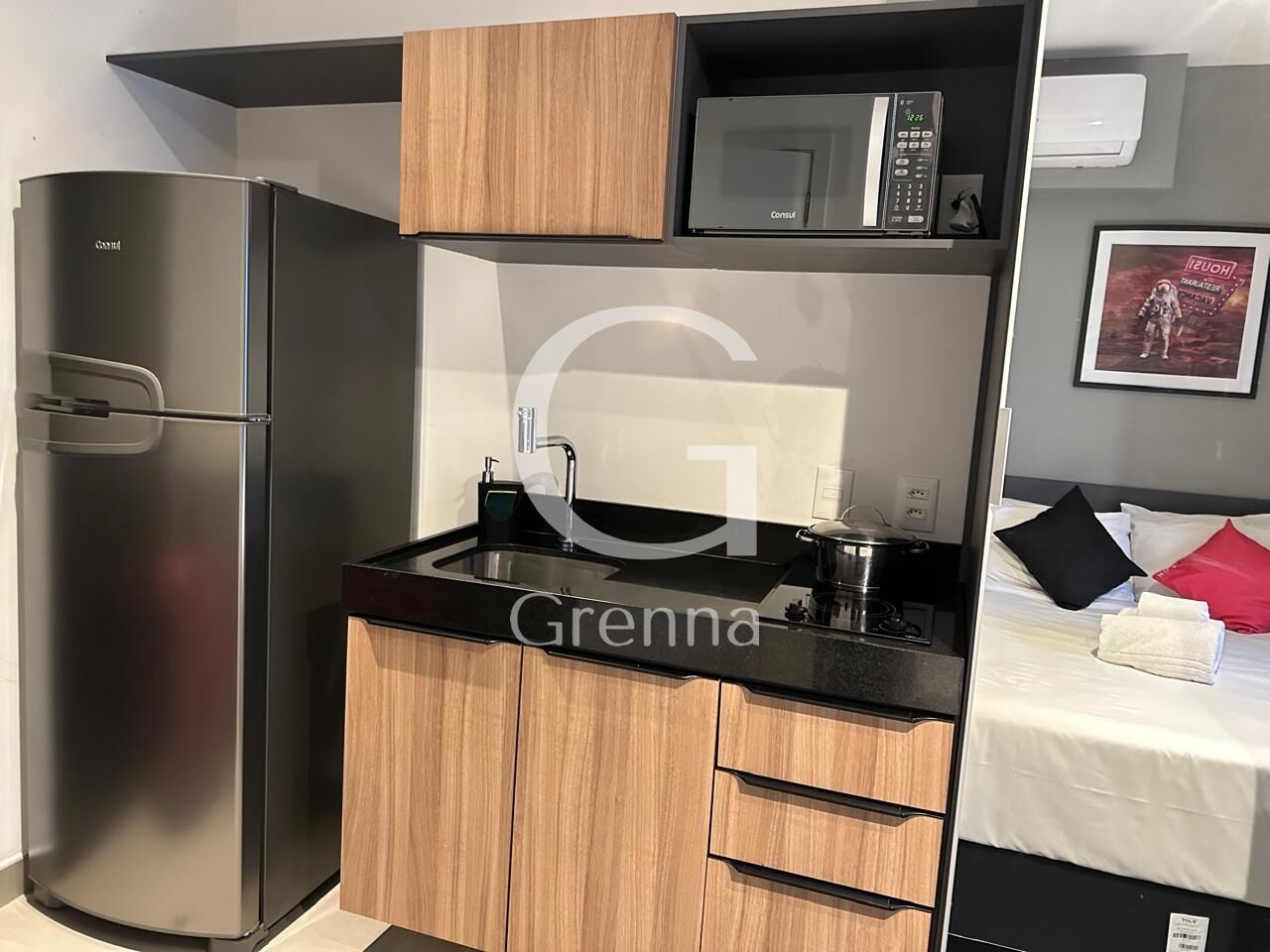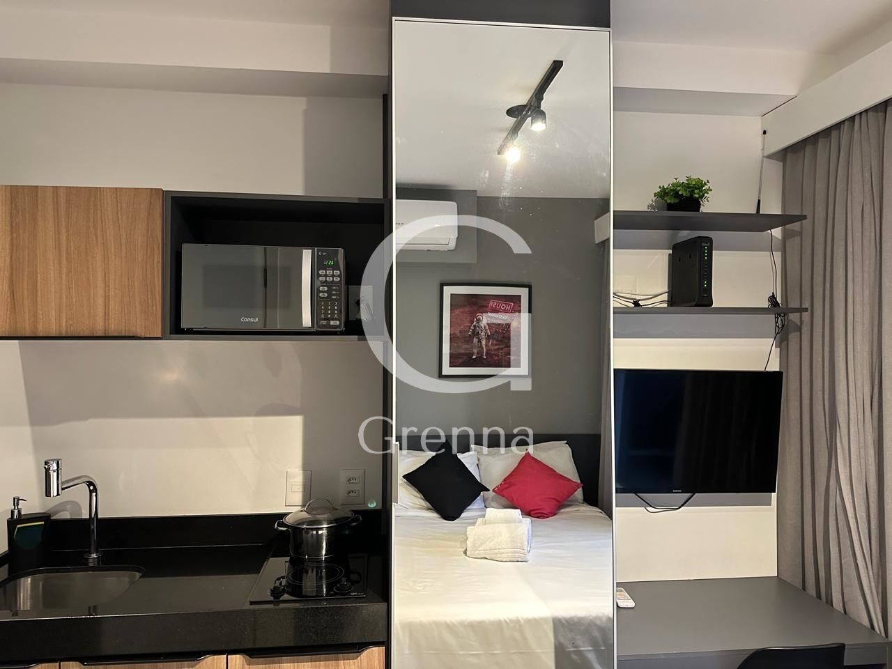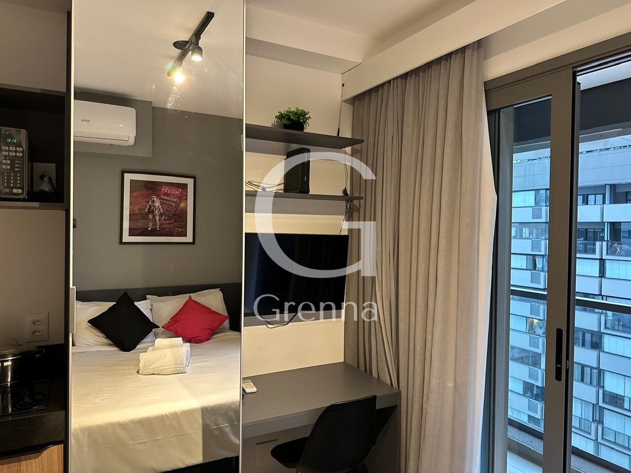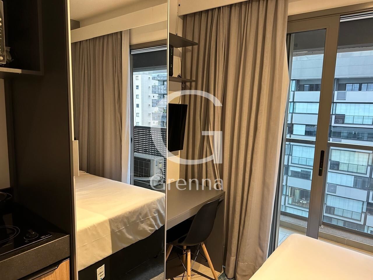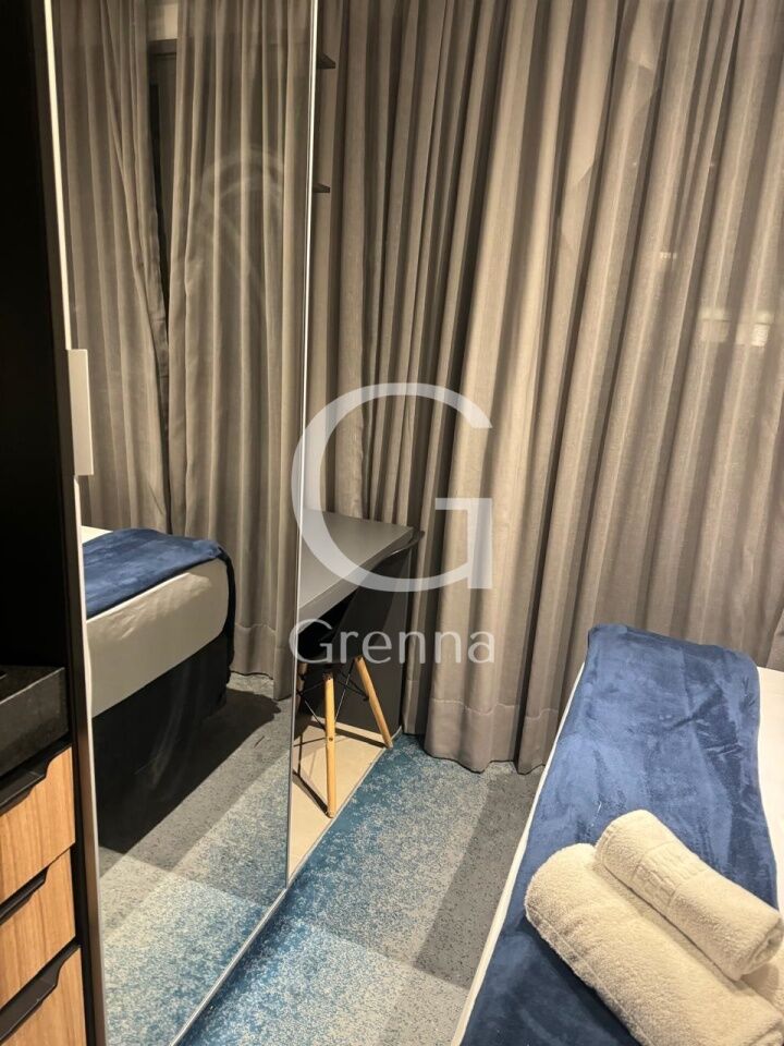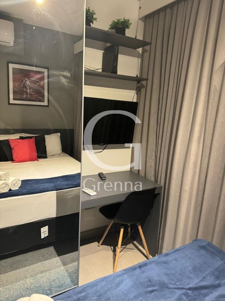 Este apartamento studio conta com 01 dormitório, varanda com área de serviço, cozinha americana e 01 banheiro.