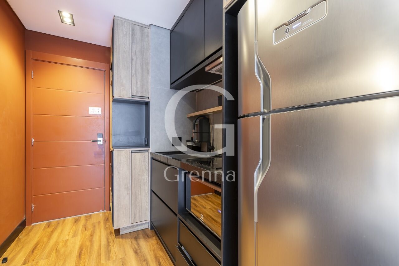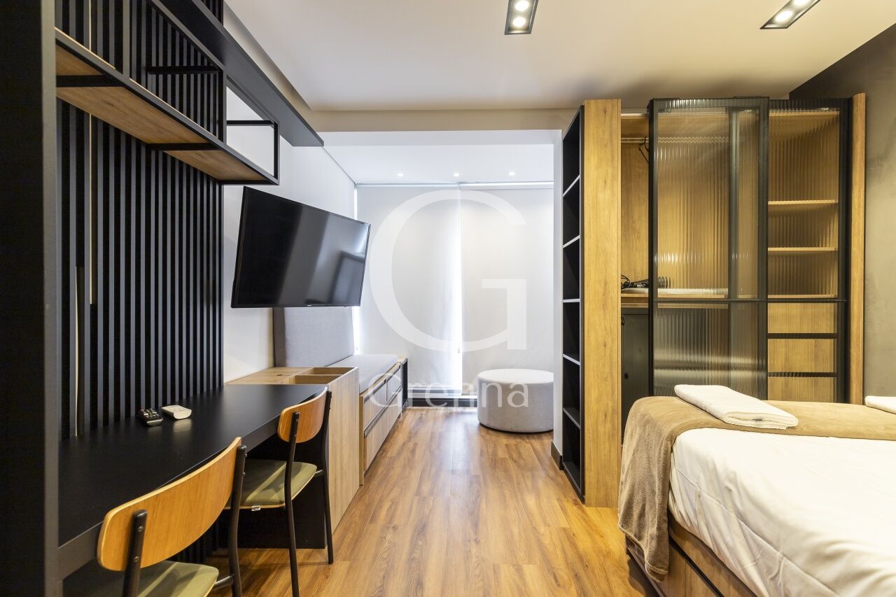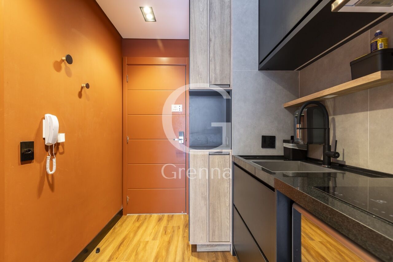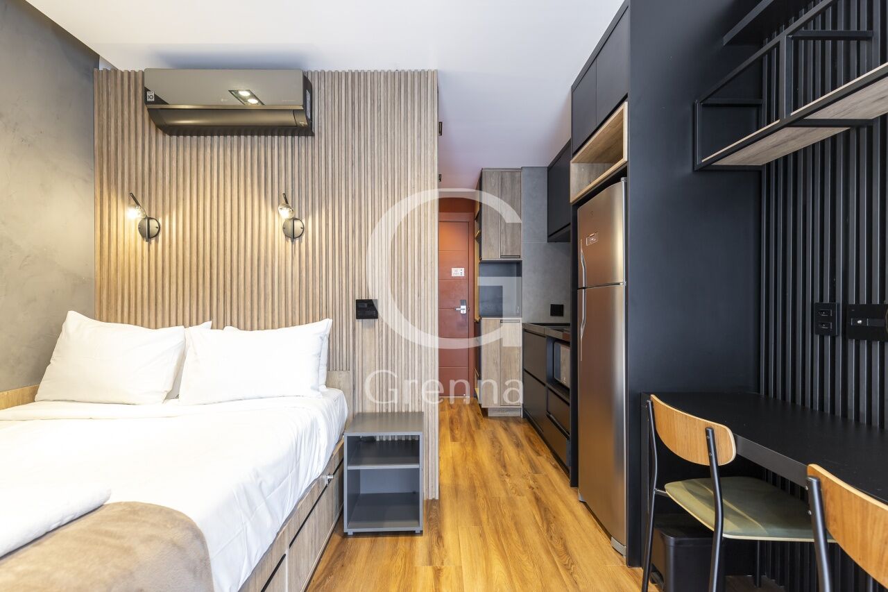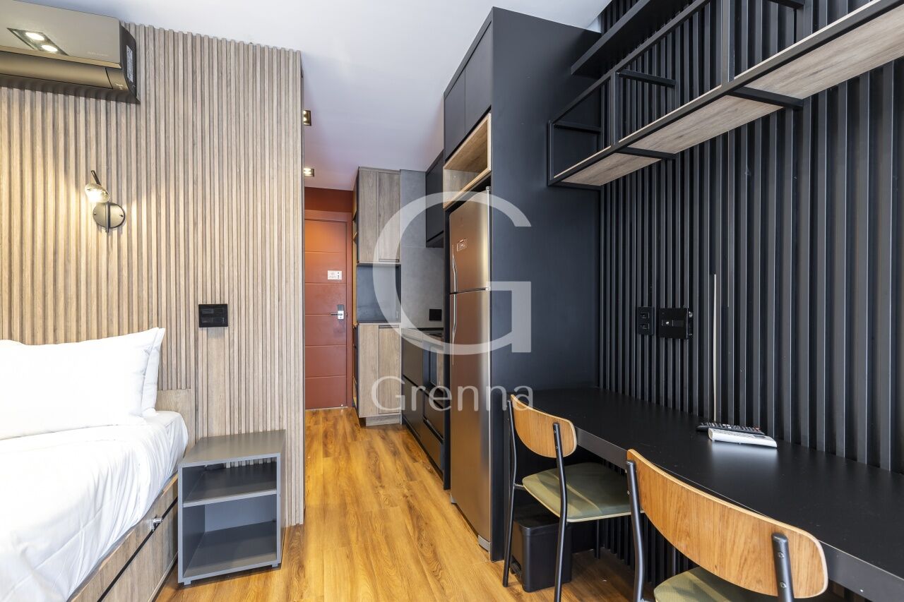 Este apartamento studio conta com 01 dormitório integrado com a cozinha americana, varanda fechada com vidro transformada em sala de estar e 01 banheiro.