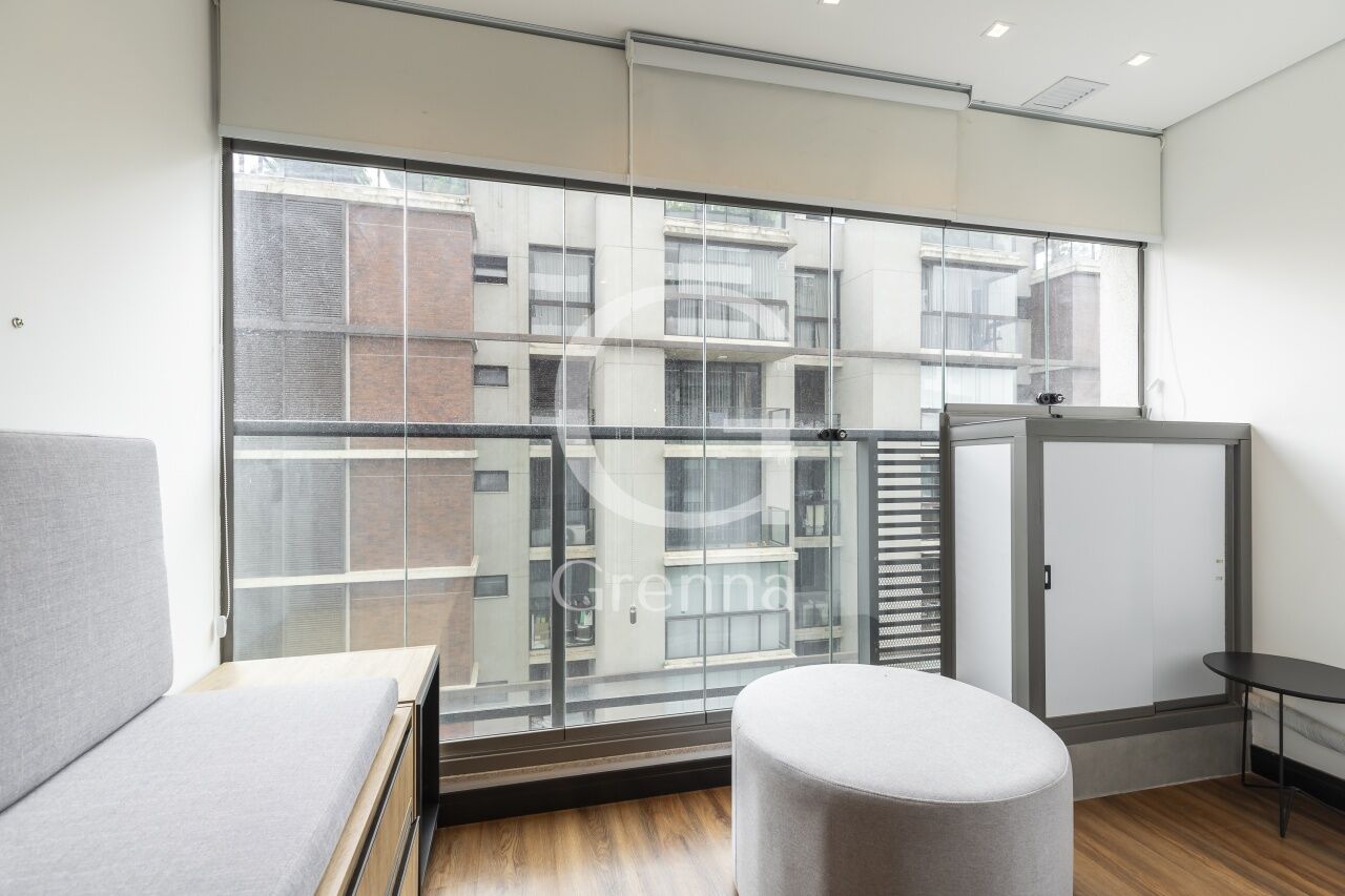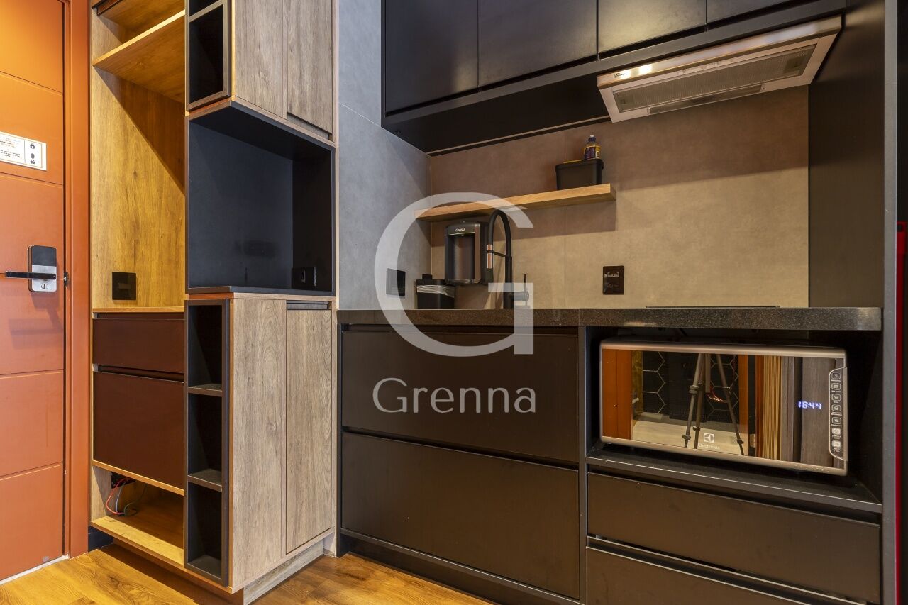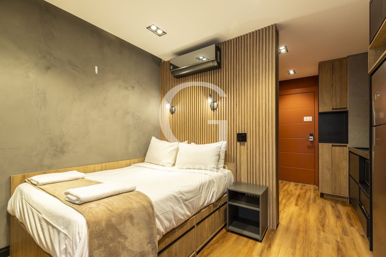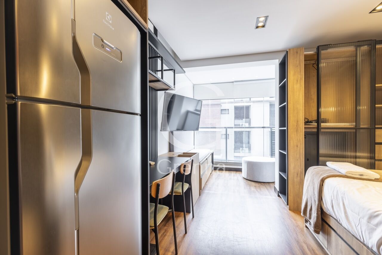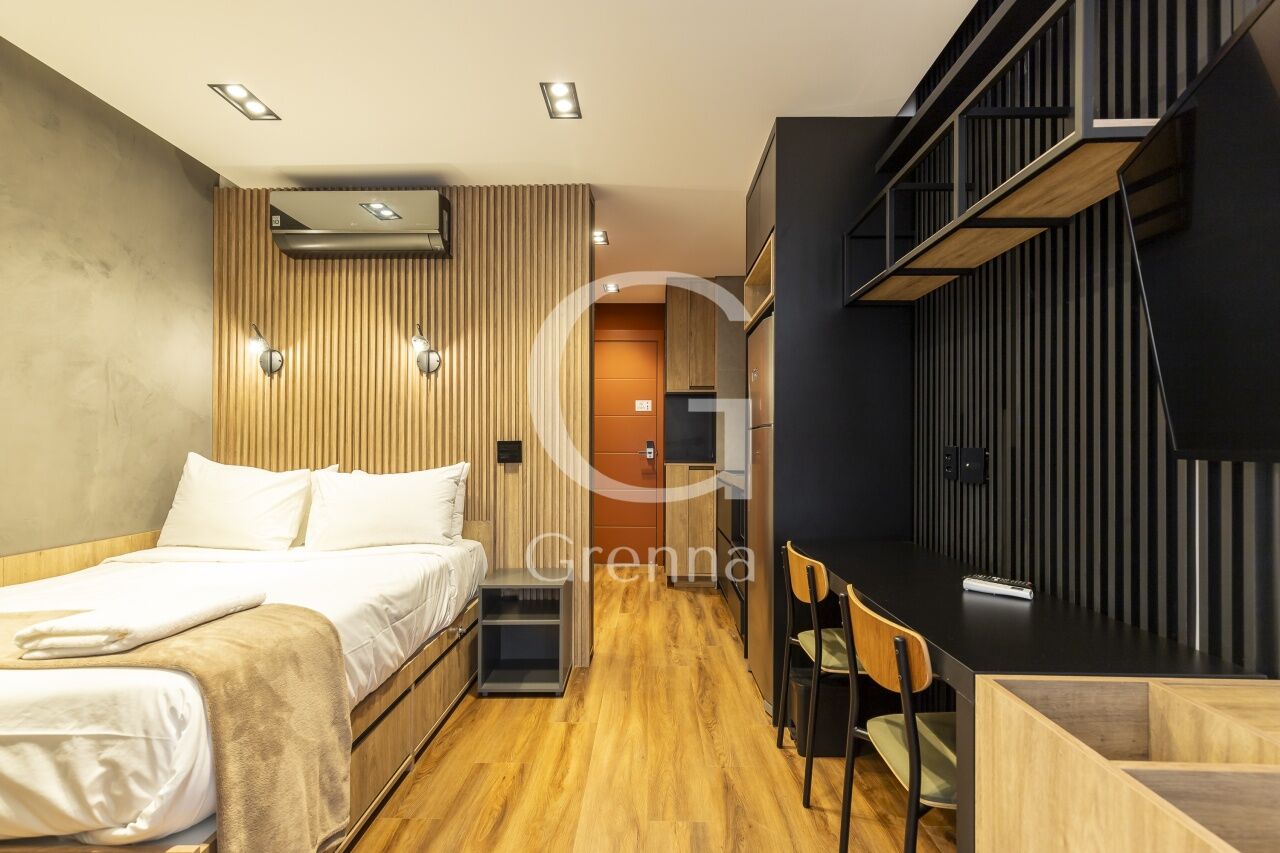 Este apartamento studio conta com 01 dormitório integrado com a cozinha americana, varanda fechada com vidro transformada em sala de estar e 01 banheiro.