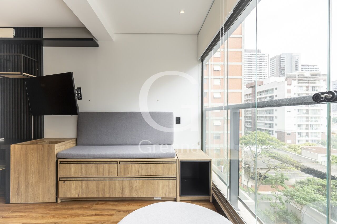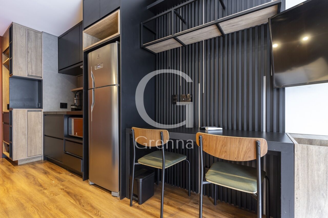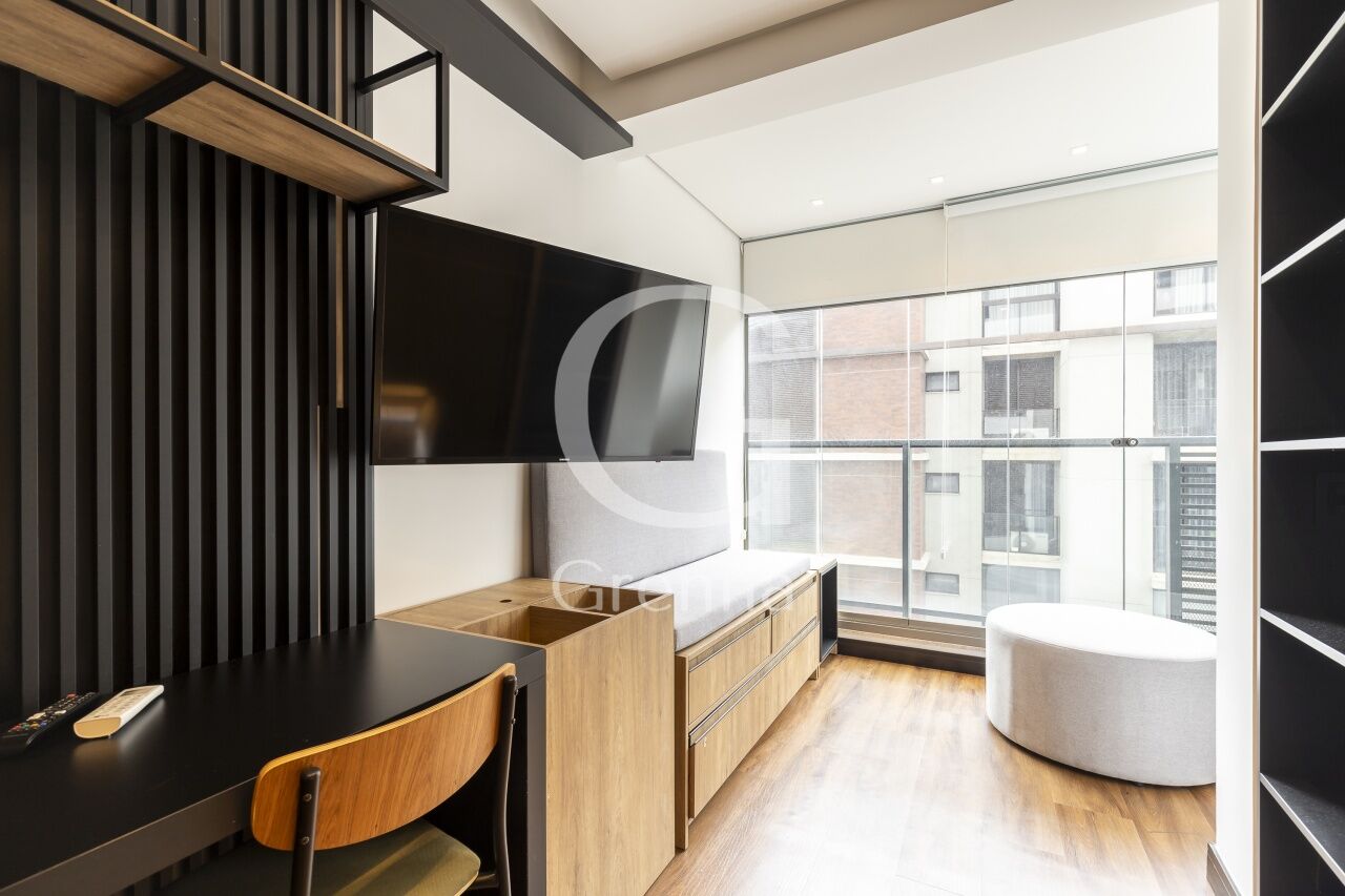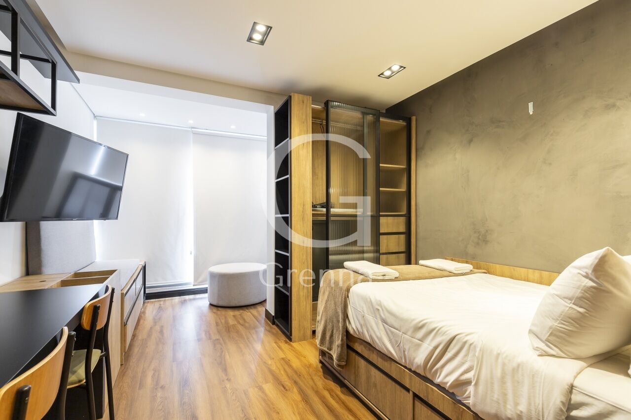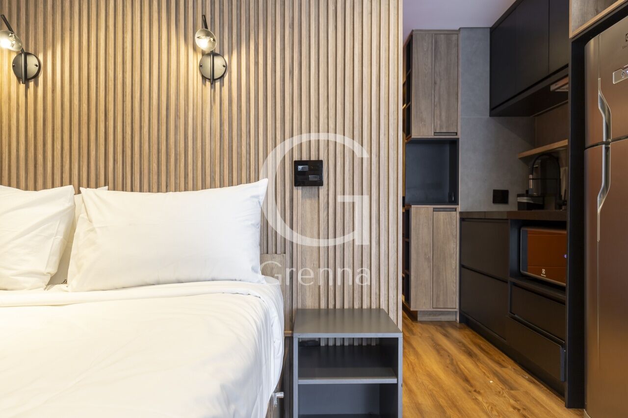 Este apartamento studio conta com 01 dormitório integrado com a cozinha americana, varanda fechada com vidro transformada em sala de estar e 01 banheiro.