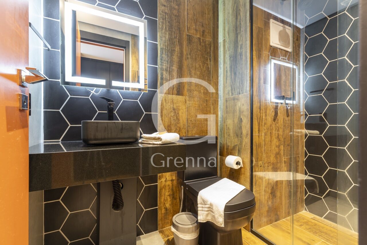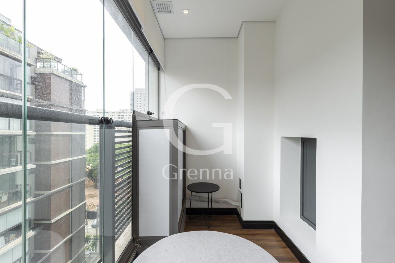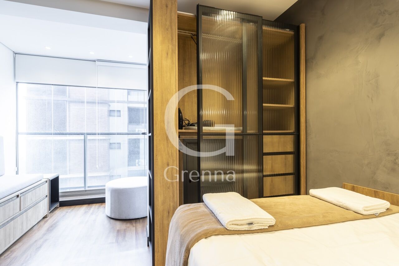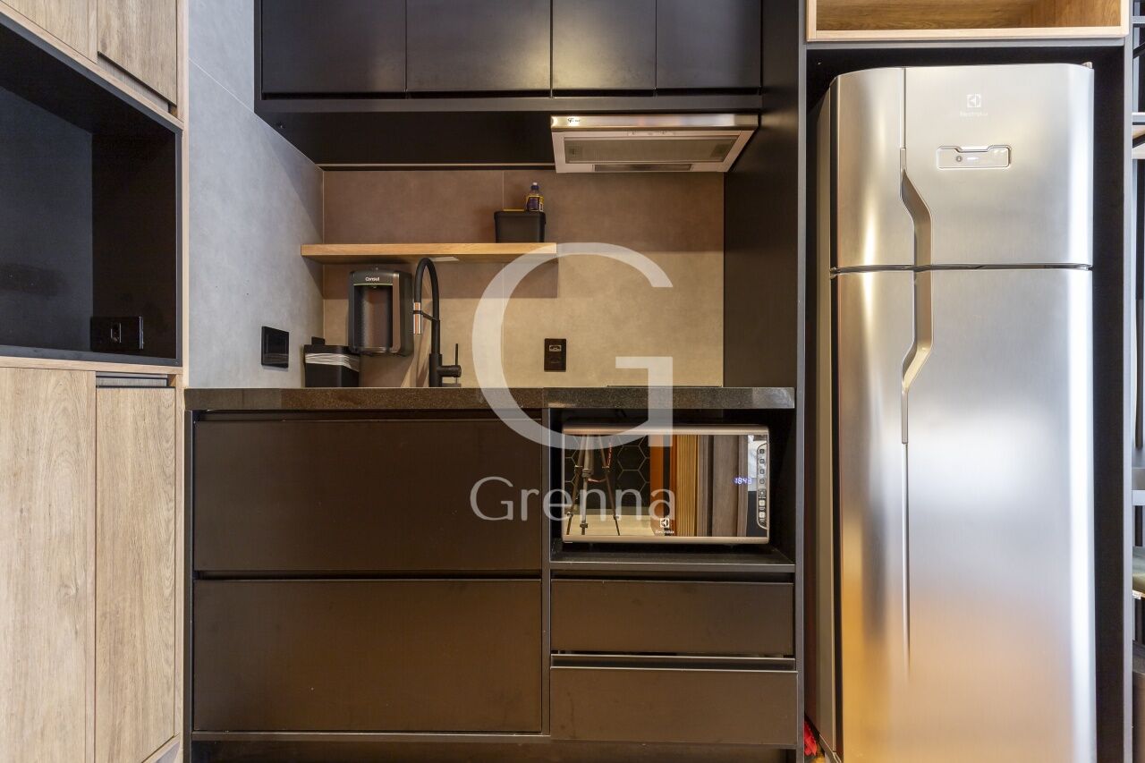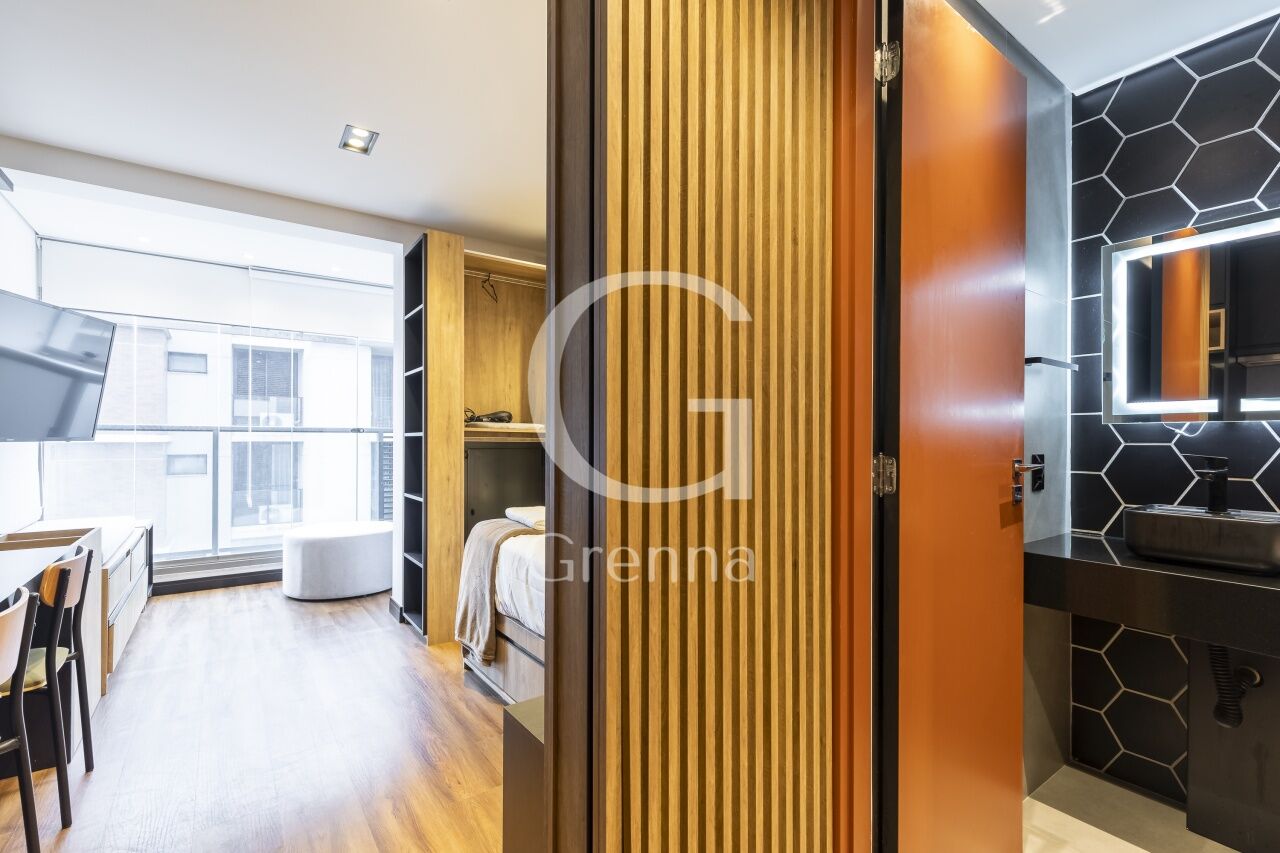 Este apartamento studio conta com 01 dormitório integrado com a cozinha americana, varanda fechada com vidro transformada em sala de estar e 01 banheiro.